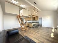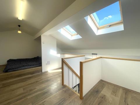 V bytě se nachází obývací pokoj s plně vybaveným kuchyňským koutem (lednice, mrazák, myčka, varná deska, horkovzdušná trouba) a lodžie, ložnice, vstupní hala, koupelna s rohovou vanou, pračkou a v rámci koupelny je oddělené WC. Schodištěm z obývacího pokoje je přístupný další obytný prostor a v bytě se dále nachází dvě praktické komory. Byt je částečně vybaven, zůstávají dvě vestavné skříně a pohovka dle dohody. Ústřední vytápění a ohřev vody je na plyn (kondenzační kombi kotel), okna plastová izolační skla, interiérové dveře dřevěné, vstupní dveře bezpečností, na podlahách je vinyl – altro, keramická dlažba a laminátová plovoucí podlaha. Do bytu je zaveden internet, a dále možnost připojení UPC.