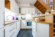 - světlý obývací pokoj s kuchyňským koutem do L a barovým pultem (indukční varná deska, elektrická trouba, digestoř, lednice s mrazákem, myčka)