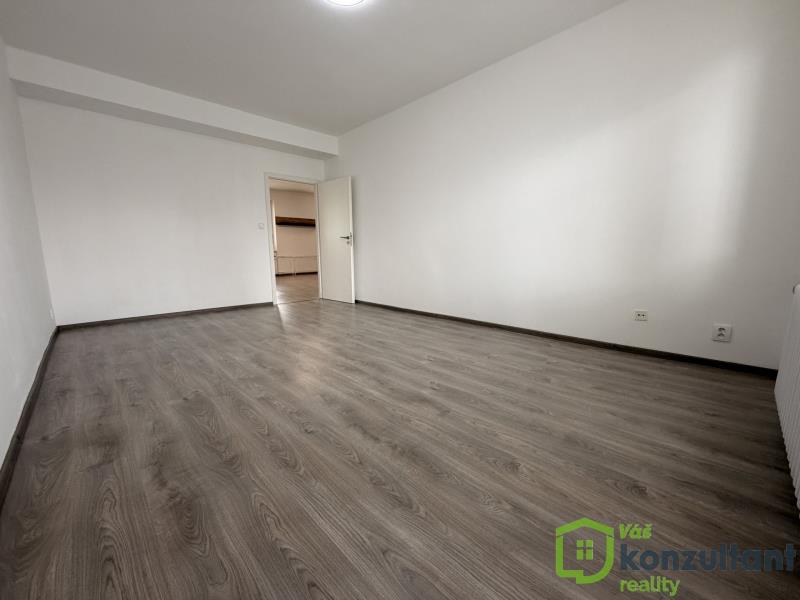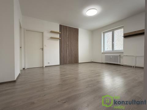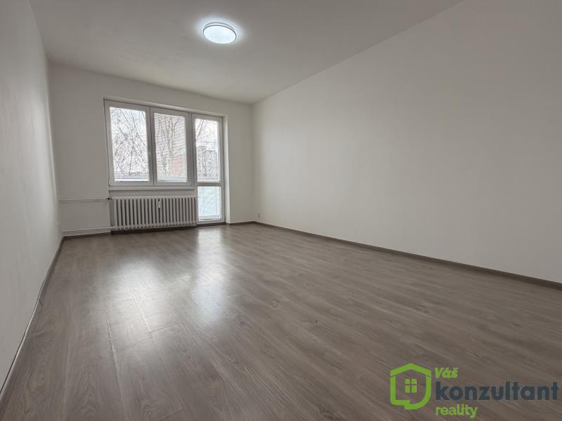 Dispozice bytu je praktická a dobře řešená. Kuchyňský kout je propojen s prostorným obývacím pokojem, což vytváří vzdušný a otevřený obytný prostor. Byt je orientován na tři světové strany, takže působí svěže, světlě a příjemně po celý den.