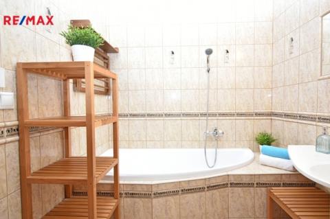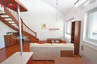 Bytová jednotka Vám nabízí vstupní chodbu s vestavnou šatní skříní botníkem a zrcadlem, samostatnou toaletu s umyvadlem a zrcadlem, kuchyňský kout s vestavnými spotřebiči (lednice s mrazákem, myčka, sklokeramická varná deska, trouba, digestoř a mikrovlnná trouba), jídelní kout (stůl + 4x židle), obývací pokoj se sedací soupravou, konferenčním stolkem, obývací stěnou a komodami, schodiště do patra a koupelnu s vanou, umyvadlem, zrcadlem, toaletou a úložnými prostory. Dále samostatnou šatnu v patře s regály, ložnici se zařízením a vstupem na terasu, ložnici se zařízením se vstupem na terasu.