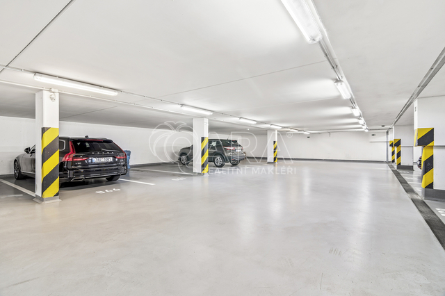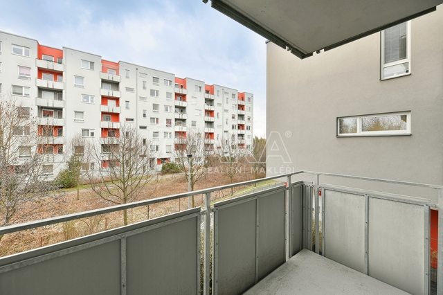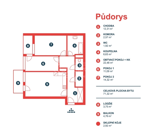 Byt o celkové výměře 83 m2 (vnitřní plocha – 71 m2, lodžie – 4 m2, balkon – 5 m2) je velice dobře dispozičně řešen a tvoří jej: obývací pokoj s kuchyňským koutem, 2x ložnice, vstupní chodba, koupelna s vanou, samostatné WC a komora. Z obývacího pokoje je možný vstup na balkon, vstupem na lodžii pak disponuje jedna z ložnic. Jak lodžie tak balkon jsou orientovány stejně jako všechna okna v bytě na západ. Byt se pronajímá částečně zařízený – kompletní kuchyňská linka včetně vestavěných spotřebičů + jídelní stůl se židlemi a obývací TV stěna. V ložnici se je umístěna volně stojící šatní skříň, v předsíni se pak nachází vestavěná šatní skříň. Podlaha je v celém bytě plovoucí laminátová, v koupelně a na WC je dlažba. Vytápění zajišťuje centrální plynová kotelna v domě. Dům je vybaven výtahem. K bytu dále náleží garážové stání, které je stejně jako sklepní kóje (2,92 m2) umístěné v suterénu.