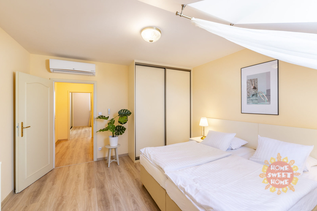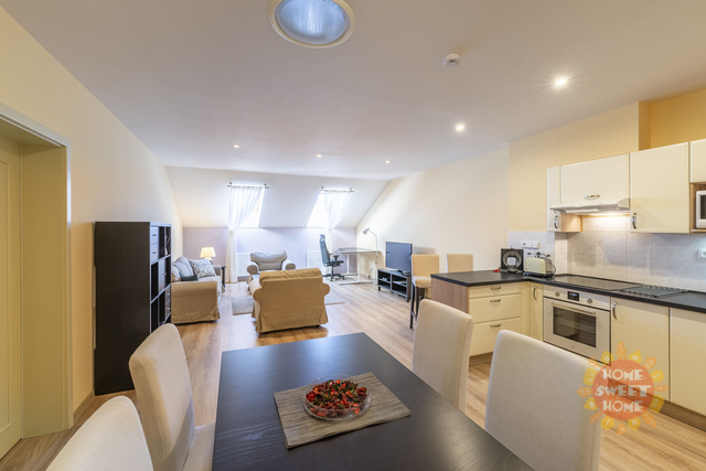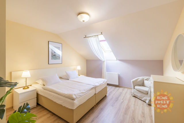 Plně zařízený podkrovní byt 3+kk k pronájmu po kompletní rekonstrukci o celkové rozloze 93 m2 se nachází v 5.patře zrekonstruovaného činžovního domu s výtahem na Vinohradech v ulici Máchova. V bytě je vstupní hala, velký obývací pokoj s posezením a TV spojený s plně vybaveným kuchyňským koutem s jídelní částí (digestoř, sklokeramická varná deska, elektrická trouba, mikrovlnná trouba, myčka, lednice, kávovar, toustovač, sada nádobí), 2 samostatné ložnice s dvojlůžky, koupelna se sprchovým koutem, pračkou, sušičkou, toaletou a druhá samostatná toaleta. Byt se nachází ve velice žádané lokalitě v blízkosti náměstí Míru s výbornou občanskou vybaveností: obchody, restaurace, lékárny, ZŠ, MŠ a další. Výborná dopravní dostupnost. V blízkosti domu je tram. zastávka Jana Masaryka a 3 min. chůze stanice metra linky A - Náměstí Míru. Byt je dostupný k pronájmu od března.