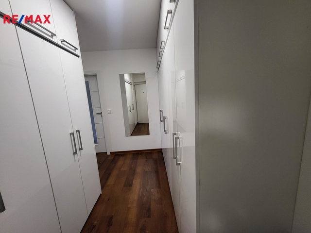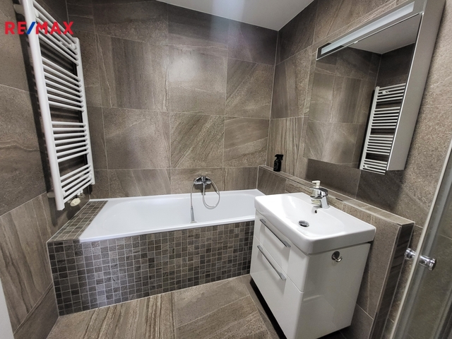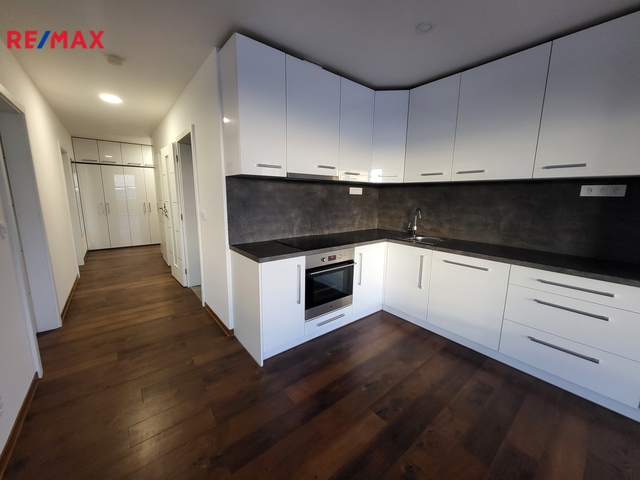 Nabízíme k pronájmu prostorný byt 3+kk o podlahové ploše 82,4 m² s terasou o velikosti 13,58 m², situovaný v 6. nadzemním podlaží moderní rezidenční budovy se dvěma výtahy. Součástí bytu je také vlastní komora umístěná na stejném patře, což zajišťuje maximální komfort. Dominantou interiéru je velkorysý obývací prostor s kuchyňským koutem a přímým vstupem na terasu, orientovaný na jihozápadní stranu. Díky velkoformátovým oknům se žaluziemi je interiér příjemně prosvětlený po celý den. Podlahové vytápění v celém bytě (s výjimkou dvou menších pokojů) zajišťuje vysoký komfort bydlení ve všech ročních obdobích. Kuchyňská linka je plně vybavena kvalitními spotřebiči, včetně sklokeramické varné desky, horkovzdušné trouby a myčky. Koupelna nabízí kombinaci sprchového koutu a vany a disponuje dostatkem prostoru pro pračku i sušičku. Ložnice je vybavena vestavnou skříní. Další nadstandardní úložné prostory jsou řešeny vestavnými skříněmi na míru v předsíni. Součástí pronájmu je také zastřešené parkovací stání za domem. - dlouhodobý pronájem - prostorný 3+kk - vlastní komora v patře - podlahové topení - velká terasa - zastřešené parkovací stání Nájemné 21.000,-Kč /měs. Služby 4.500,- Kč/ měs. Kauce 51.000,-Kč Elekřina se přepisuje na nájemce. Provize RK 21.000,-Kč + DPH Byt je čerstvě vymalovaný a připravený k okamžitému nastěhování.