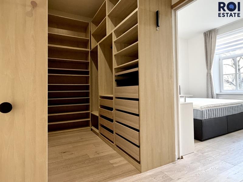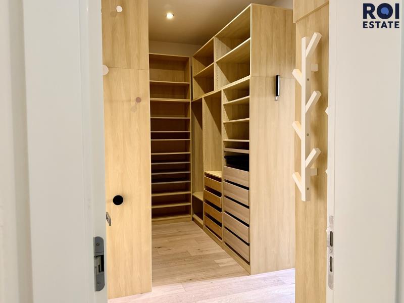 Kvalitní postel Hästens, designová svítidla, vestavěné skříně, stylová šatna u ložnice hlavní.
