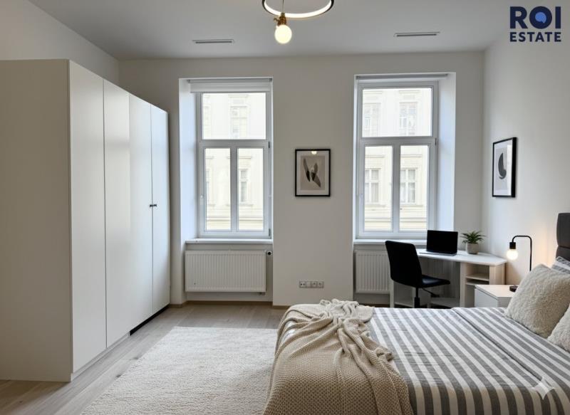 Druhý pokoj do vnitrobloku je prázdný. Třetí pokoj je vybavený postelí, skříněmi i stoly.
