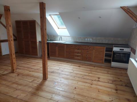 Nabízíme k pronájmu podkrovní atypický byt o výměře 167 m2. Byt je po rekonstrukci. Kuchyně je propojena s obývákem, velikou obytnou chodbou. Jsou zde pak 3 pokoje se dvěma vestavěnými skříněmi, nová koupelna se sprchovým koutem a samostatné wc. O patro níže je uzavřený přístup do bytu s další prostornou chodbou a kumbálem. K dispozici je také úložný prostor půdy, která je přístupná z bytu. Vytápění je řešeno plynovým kotlem s ohřevem vody. Nájemníci mohou využívat zahradu přilehlou k domu, případně garáž za příplatek k nájmu. Parkování za domem. Měsíční nájem činí 13000,-Kč, vodné a stočné podle počtu osob, elektrika a plyn budou vedeny na nájemce. Vratná jistota 26000,-Kč, ,provize RK 13000,-Kč. Preferujeme nekuřáky bez domácích mazlíčků. Dojezd na hraniční přechod s Německem 10 min.