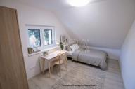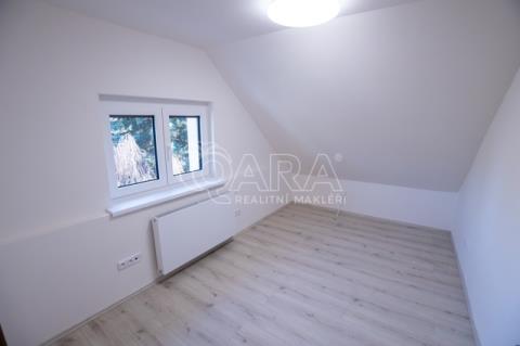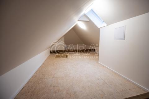 Dispozice bytu nabízí vstupní halu s úložným prostorem, světlý obývací pokoj s kuchyňským koutem, dvě neprůchozí ložnice a jeden průchozí pokoj, který může sloužit jako pracovna, šatna nebo další ložnice. Součástí je koupelna se sprchovým koutem, samostatné WC a praktický podkrovní prostor o velikosti 23 m², vhodný jako sklad, hobby místnost nebo herna.