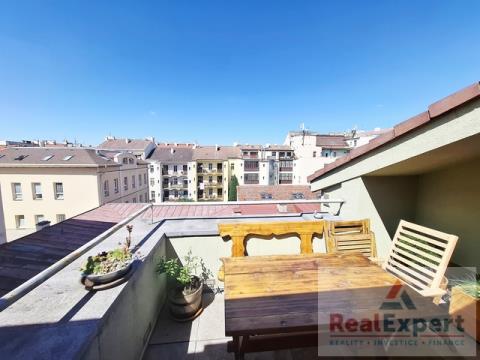 Nabízíme k pronájmu prostorný mezonetový byt o velikosti 5+kk/Terasa, o celkové ploše 166 m2, situovaný v 5. NP (poslední patro) s výtahem v bytovém domě v Praze 2 - Vinohrady, ul. Máchova. Ve spodním patře bytu je velký obývací pokoj s kuchyňskou linkou, dvě ložnice, prádelna, koupelna s vanou, sprchovým koutem a WC, dále druhé samostatné WC a prostorná chodba s úložnými prostory. V horním patře jsou dvě samostatné ložnice. Kuchyňská linka je vybavena vestavnými spotřebiči: varná deska, pečící trouba, digestoř, myčka, mikrovlnná trouba. Terasa je orientovaná do klidného vnitrobloku. Topení v bytě je ústřední (vlastní elektro-kotel). Lokalita se skvělou občanskou vybaveností - obchody, školy, školky, lékaři atd. i skvělým spojením do centra Prahy - tramvají cca 5 min. Doporučujeme. K nastěhování ihned.