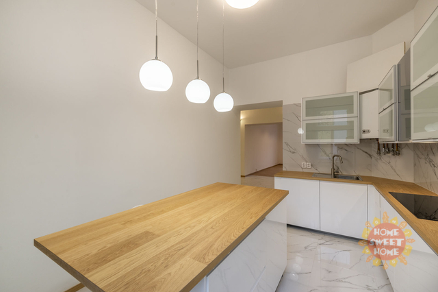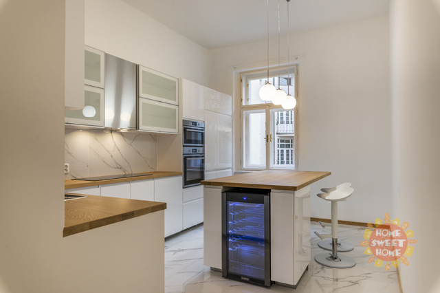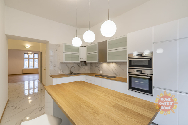 Zcela nově zrekonstruovaný krásný byt 6+1 k pronájmu, nezařízený po kompletní rekonstrukci o celkové výměře 200 m2, který se nalézá ve čtvrtém nadzemním patře nádherného secesního domu s výtahem na Rašínově nábřeží 58, který patří k jedněm z nejkrásnějším domů na nábřeží. V bytě se nachází prostorná vstupní hala s vchody do jednotlivých neprůchozích pokojů, plně zařízená kuchyň (lednice, mrazák, varná deska, digestoř, trouba, myčka na nádobí, vinotéka a pračka), dvě koupelny vybavené (v jedné rohová vana a WC, druhá je se sprchovým koutem). Další WC samostatné zvlášť. Podlahy jsou pokryty novou dřevěnou podlahou a velkoformátovou dlažbou. Nájemníci mají k dispozici vlastní bazén o velikosti 6 x 11 m s celoročním provozem, vířivou lázeň, saunu a posilovnu v prostorách domu. V suterénu je k dispozici kulečník, šipky a malý bar pro příležitostné použití. V domě je 24 hodinová ostraha, která se stará o klidné a nerušené bydlení v domě, společné prostory jsou monitorované kamerou. V přízemí domu se nachází restaurace "U Kalendů" s výbornou kuchyní a také pekárna, kde mají každý den výborné čerstvé a křupavé pečivo. Možnost pronájmu garážového stání v nedalekých garážích za 5.000 Kč/měsíc. Úžasná lokalita v centru Prahy, výborná dostupnost do všech pražských částí, kompletní občanská vybavenost. Ihned k dispozici. Doporučujeme prohlídku!