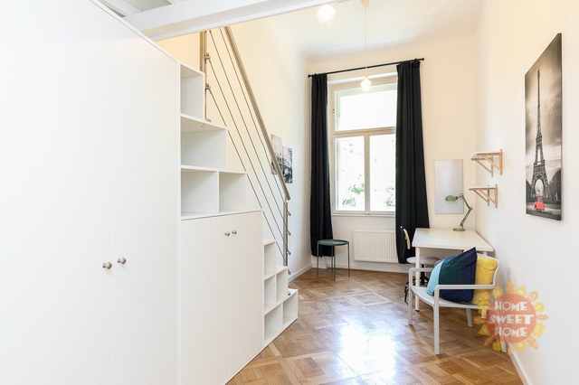 Nabízíme krásný, plně zařízený pokoj o velikosti 12 m² s patrem na spaní, který se nachází ve zvýšením přízemí cihlového domu v rezidenci Kinských na náměstí Kinských, Praha 5. Dům prošel kompletní rekonstrukcí v roce 2019. Pokoj je součástí čtyřpokojového bytu s plně vybavenou kuchyní, jídelním koutem, dvěma koupelnami a samostatnou toaletou. Společné prostory jsou kompletně vybaveny včetně žehličky, úklidových pomůcek a dalších potřeb pro běžný provoz. Samotný uzamykatelný pokoj je vybavený pracovním stolem, šatní skříní, přikrývkou a polštářem. Internet a úklid společných prostor (1× týdně) jsou již zahrnuty v ceně nájmu. Nájemníkům je dále k dispozici fitness, prádelna (na mince) a společná terasa. Rezidence se nachází ve velmi oblíbené lokalitě v těsné blízkosti centra města, nedaleko zahrady Kinských a parku Petřín. V okolí je vynikající občanská vybavenost – obchodní centrum Anděl, Cinema City Nový Smíchov, školy, restaurace, bary a mnoho dalšího. Rovněž dopravní dostupnost je výborná: tramvajová zastávka Újezd (200 m), metro Anděl (10 minut chůze) nebo vlakové nádraží Praha–Smíchov (5 zastávek tramvají). Bydlení je vhodné především pro studenty na střednědobý pronájem. Pokoj je volný od začátku února 2026.