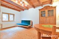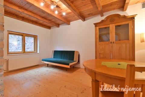 V obývacím pokoji jsou k dispozici dvě policové skříně ,stůl rozkládací a židle, rozkládací pohovka, též těleso- topení.
