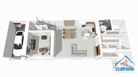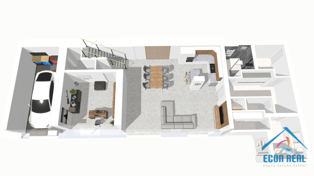 Přízemí: vstupní chodba se zádveřím, šatna, technická místnost, koupelna se sprchovým koutem a toaletou, úklidová místnost, obývací pokoj s plně vybaveným designovým kuchyňským koutem a s výstupem na terasu a zahradu, pracovna, schodiště, zadní východ k dílně a na zahradu a vnitřní vstup do garáže.