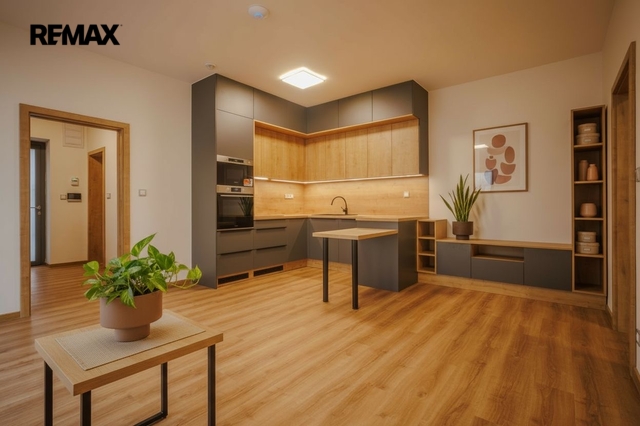 Byt se nachází v 1. NP, má v rámci objektu zcela samostatný vstup a vlastní velkoformátový portál směrem na terasu/zahradu. Dispozice 2+kk, v předsíni zabudovány velmi dobře řešené vestavné skříně, koupelna má příjemných 7 m2, nadstandardní až velkorysá kuchyňská linka s vestavnými spotřebiči, samostatná ložnice, velmi komfortní podlahové vytápění. Vše vybudováno nově, právě vy tedy můžete být prvními obyvateli. Byt se pronajímá nezařízený, nábytek na fotografiích je pouze dekorativní.